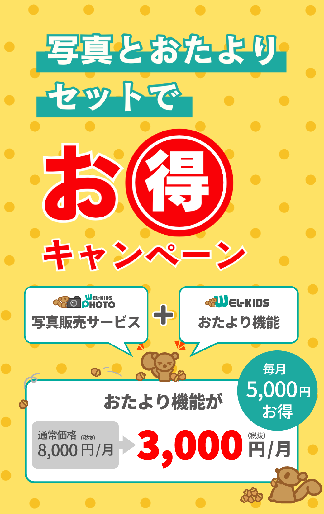 ウェルキッズ おたより機能を月額3,000円(税抜)の特価でご利用いただけます。 |